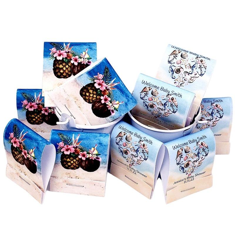 Personalized tropical beach or luau matchbook mints, an inexpensive useful favor idea, perfect for baby and bridal shower, wedding, anniversary and birthday parties, you can't order too many! Custom beach theme party favors, with so many color combinations, you are sure to design one you love! These mints are a creative and useful decoration idea, scatter these cute mint favors on your party tables to add color and a personalized touch. Hidden inside of each matchbook mint cover you will find your choice candy. Printed on heavy weight card stock, personalize with your wording and create an inexpensive party favor.